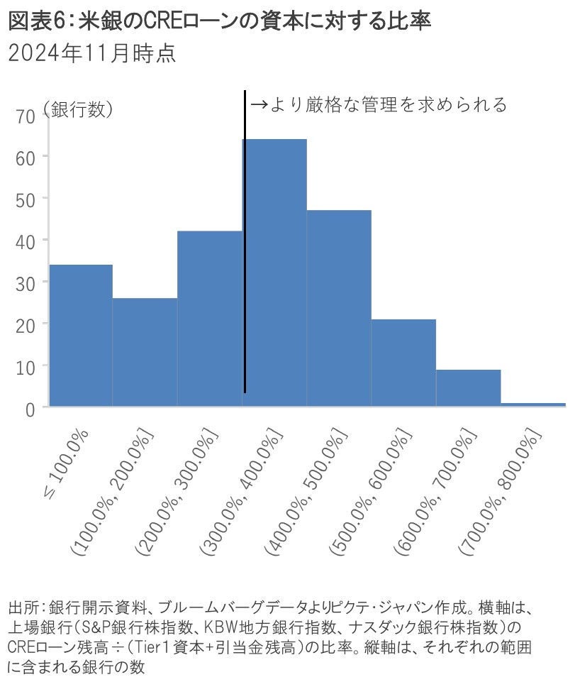 次葉図表6の通り、上場銀行中約4割の銀行がこの資本対比の基準を超えるCREローンを抱えている。自行の財務改善のためにこれらのローンを縮小させれば、CRE市場の一層の悪化を招くことが懸念されている。