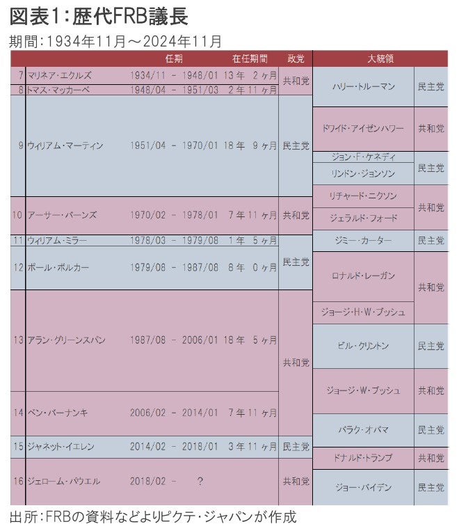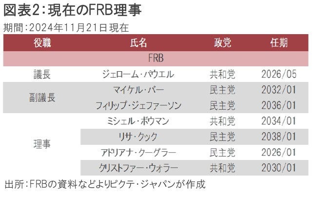 現在の理事の任期を改めて確認すると、トランプ次期大統領の在任中に任期を迎えるのは、パウエル議長、2026年1月に満了を迎えるアドリアナ・クーグラー理事だけだ(図表2)。FRB理事は2年に1人ずつ任期を迎えるため、大統領の1期の任期中に任命できるのは7人中2名に過ぎない。