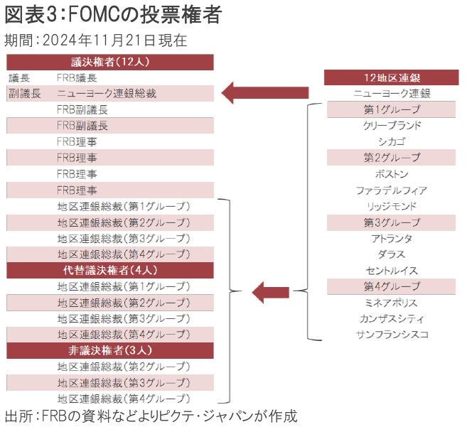 また、FOMCで投票権を持つのは、FRB理事7名、ニューヨーク連銀総裁、残り11地区連銀総裁のなかから輪番で4名、計12名だ(図表3)。地区連銀総裁は、各地区連銀の取締役会が候補者を選任し、FRB理事会の同意を得ることで任命される。大統領が12地区連銀総裁の人事にまで容喙することは不可能だろう。