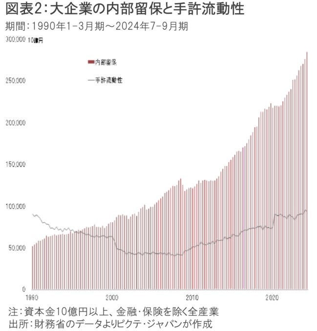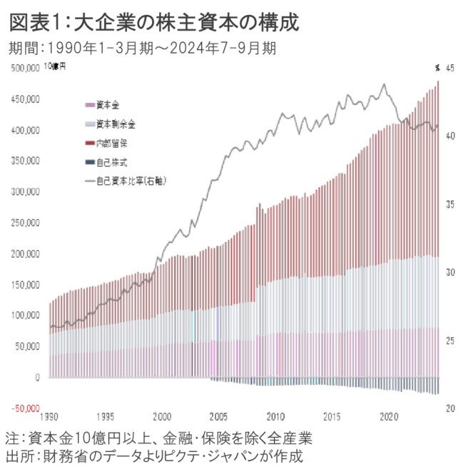 上場企業との重なりが多いと見られる法人企業統計の大企業の場合、2024年7-9月期、自己資本は47兆9,826億円で過去最大を更新、自己資本比率は2019年10-12月期の43.8%からやや低下したものの、40.9%の高水準だった(図表1)。この肥大化した自己資本は、株主資本利益率(ROE)が低い要因であることは間違いない。