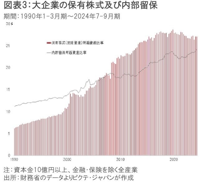 ちなみに、資産の部において過去10年間で最も大きく増加したのは、固定資産に計上されている株式だ。その額は121兆2,693億円に達する。具体的には海外子会社株式や政策投資、持ち合い株式である。バランスシート上では、貸方(右側)の負債と資本の合計に対する内部留保の比率が高まるに連れ、借方(左側)では総資産に対する保有株式のウェートも上昇してきた(図表3)。
