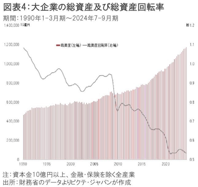 ただし、現段階では全く十分ではない。それを端的に示すのが総資本回転率で、1990年代初頭は1.0回を上回っていたが、足下は0.53回へと落ち込んだ(図表4)。これは、日本の大企業が無駄な資産を抱えており、資産回転率が低水準となる結果、ROAの低下が続いていることを示すだろう。