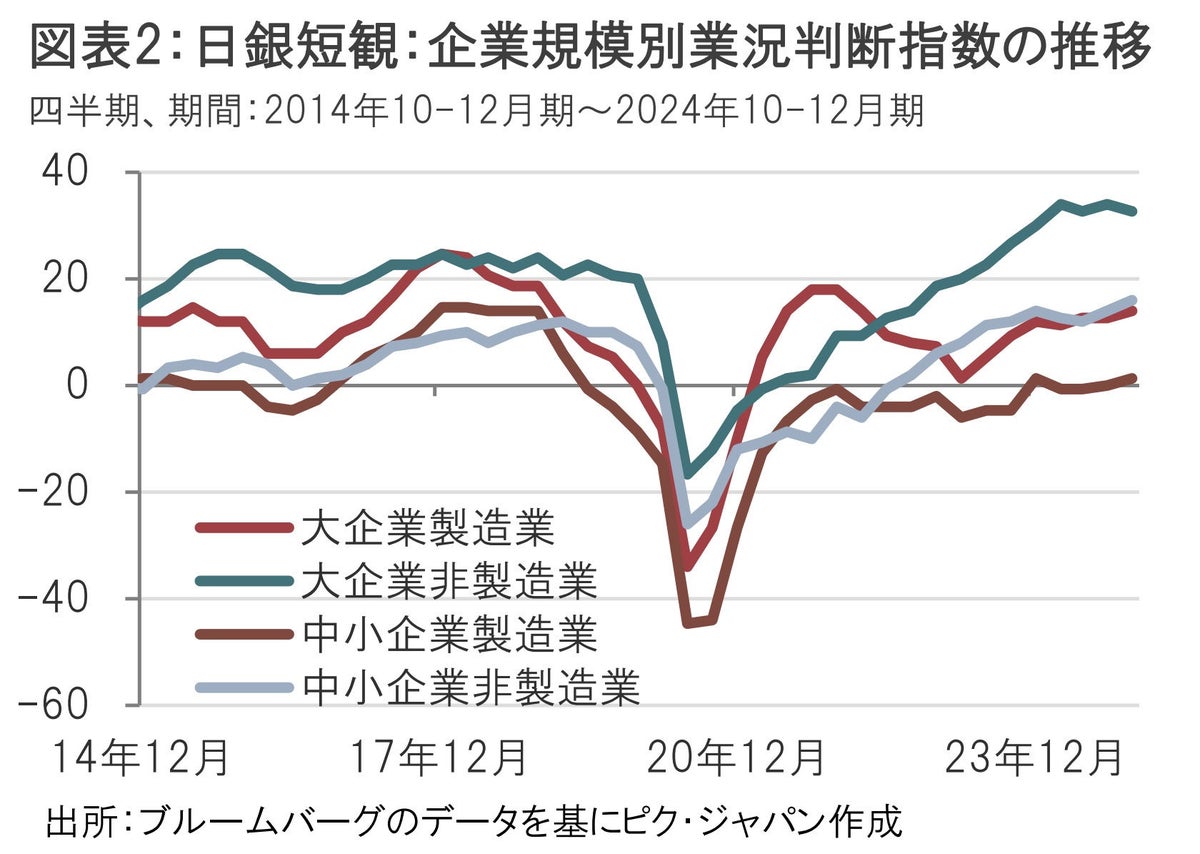 一方で、今回の短観に利上げの不安要素をあえて探すと、先行きに慎重さが見られた。業況判断指数の先行きは製造業が13、非製造業が28を見込みやや警戒心がみられる。海外需要の伸び悩みや人手不足などが懸念材料とみられる。