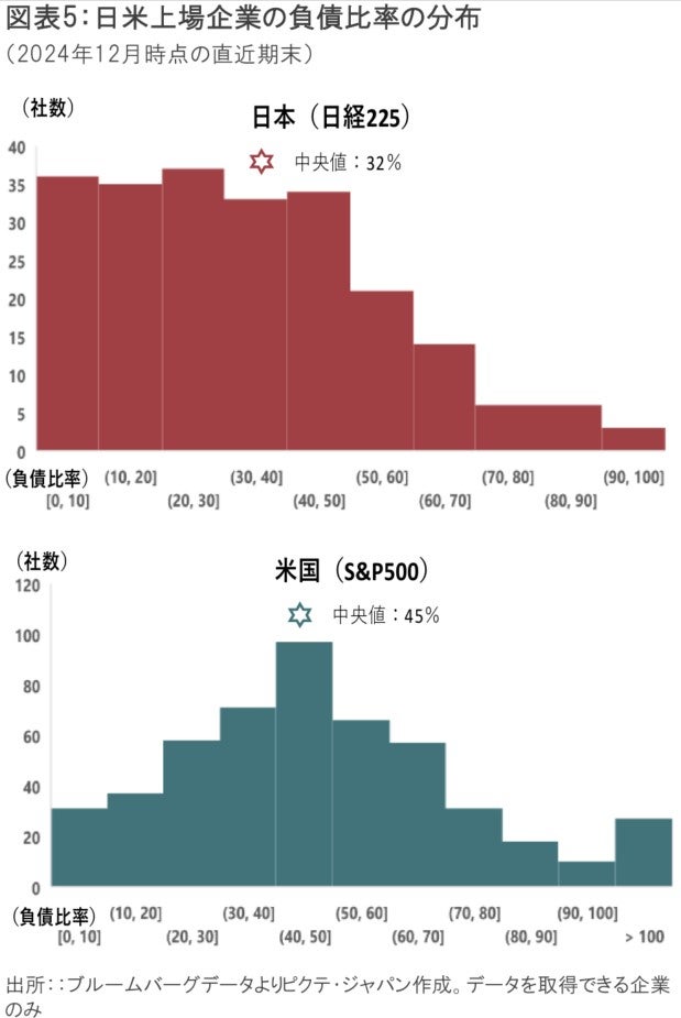上場企業に対する影響はどうか。日経平均構成企業の負債比率(有利子負債÷純資産)の割合の中央値は、例えば米S&P500構成銘柄に比べて低く、ばらつきも小さい(図表5)。