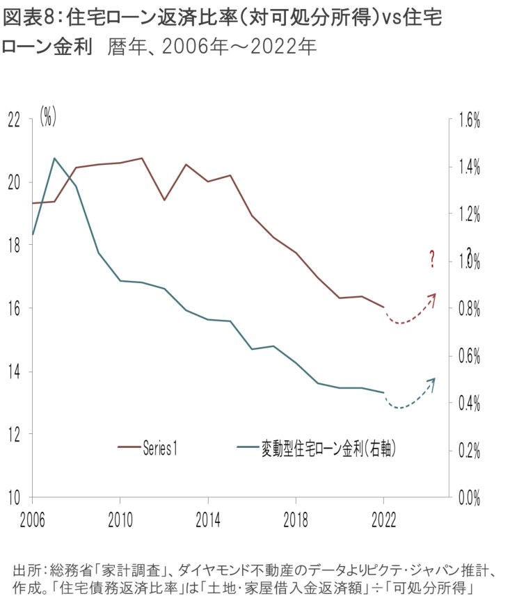 しかし、金利の上昇幅が0.5~1ポイント程度に留まるなら、住宅需要を大きく冷やすまでには至らなそうだ。家計の住宅ローン返済負担は今のところ極めて低位で推移している(図表8)。現在の平均的な家計の残存ローン金額は1800万円程度とみられる(国土交通省、2022年)。これに対し変動型住宅ローン金利が0.5~1ポイント上昇した場合の返済額の増加は月々4000~8000円程度(30年返済、現在の平均的な変動金利=0.4%を前提)である上、既存の借入については当面返済額が据え置かれるのが一般的であるためだ。但し、もし銀行に住宅ローン貸出を抑制する動きが出れば話は別だ。住宅ローンの借りやすさが個人の住宅取得熱を高めている大きな要因の一つであるためだ。しかし、金利上昇で銀行の貸出意欲は、むしろ上昇する可能性があると考えられるため、こうした銀行の貸出抑制による住宅価格下落というシナリオもまだ考えにくい。