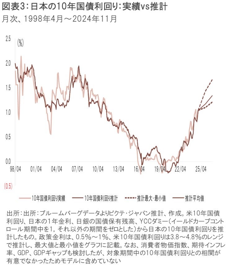 政策金利の上昇を前提とした場合、長期金利はどの程度上昇するだろうか。政策金利が0.5%~1%まで上昇し、日銀が国債購入を予定通り縮小する前提で、日米の国債利回り、日銀の国債保有残高等から日本の10年国債利回りを推計したものが図表3である。
