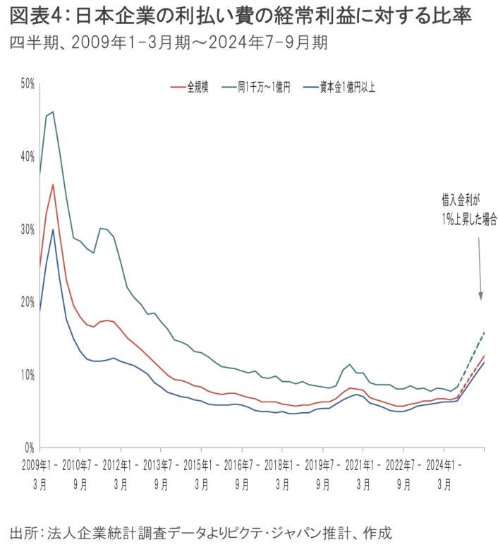 図表4は、日本の法人企業全体の年間利払い費の経常利益に対する比率を示している。仮に、企業の借入金利が24年7‐9末比で1.0ポイント上昇した場合、利払い費の経常利益に対する割合は、現在の約7%から13%程度まで上昇する。これは、2013年の異次元緩和前の水準に匹敵する。特に影響が大きいのは資本金が1千万円から1億円未満の小規模企業である。利払い費の経常利益に対する比率は現在の8%から16%に上昇する。