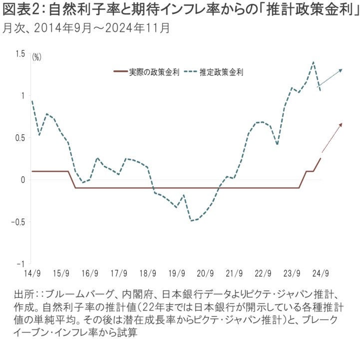 この計算によれば、日本の適正な政策金利は1%を超えるレベルとなり、現在の政策金利と約0.9ポイントも乖離している。因みに米国の政策金利と同様の手法で算出された推定政策金利との差は0.3ポイント程度となっている。