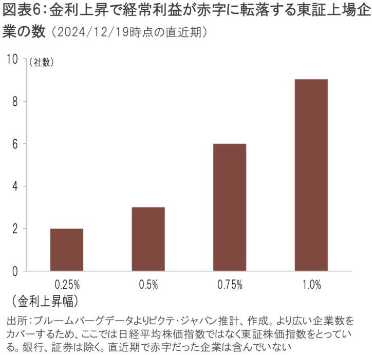 このため、金利上昇に対する耐性は総じて高いと考えられる。金利が1%上昇した場合に、経常利益が黒字から赤字に転落する企業の数は、東証株価指数の構成銘柄全体で、10社にも届かないレベルである(図表6。銀行、証券を除く。直近期に経常赤字だった企業は含まない)。