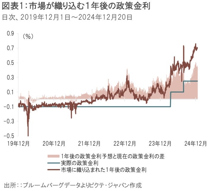 一方、同日発表された「金融政策の多角的レビュー」では、量的緩和等の非伝統的な金融政策手段は、短期金利の操作という伝統的な手段に比べて効果が不確実とし、「可能な限りゼロ金利制約に直面しないような政策運営が望ましい」とした。つまり、いざという時、金利が下げられる余裕ができるように、政策金利を引き上げておくべきという考え方である。これらを受け、1年後の政策金利の市場予想は0.7%程度の高留まりが続いている(図表1)。