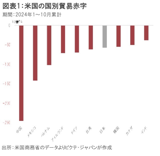 トランプ次期大統領は、昨年11月25日、就任後、麻薬性鎮痛剤フェンタニルの違法輸入に関し、製造元とされる中国に10%の追加関税、密輸入ルートであるメキシコ、カナダからの全輸入品に25%の関税を課すと発表した。オピオイド中毒が深刻化していることは間違いない。一方、昨年1-10月の貿易赤字を国別に見ると、中国がトップで2,454億ドル、メキシコは2番目の1,419億ドル、カナダは9番目で505億ドルだった(図表1)。本件には通商問題も絡むと考えるべきだろう。