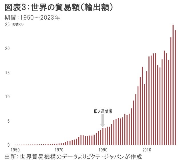 1991年12月25日の旧ソ連崩壊により東西冷戦が終結、国際社会はグローバリゼーションの時代に突入した。米国主導でサプライチェーンが統合され、労働コストが低く、教育水準の高い中国、ASEAN、メキシコ、インドなどが工業化を達成したのだ。2023年までの33年間、世界の貿易額は年率6.0%のペースで成長した(図表3)。