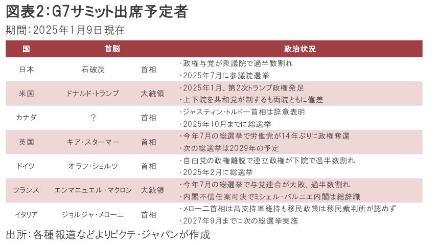 カナダは今年のG7サミット議長国だ。しかし、同国の政治の不透明感などから、年が明けてもサミットの日程は確定していない。2025年におけるG7の関係を象徴する事象と言えよう。