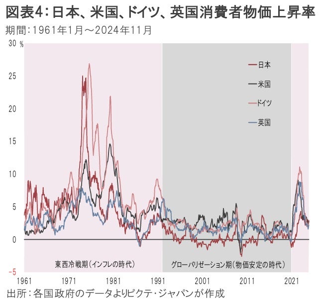 分断の時代は経済がブロック化し、サプライチェーンが統合されないため、どうしてもコストが上がる。さらに、米ソの代理戦争的な地域紛争が資源価格を高騰させ、1960~80年代の世界経済は明らかにインフレの様相を呈していた(図表4)。一方、1990~2010年代のグローバリゼーションの時代は、国境を越えたヒト、モノ、カネの移動の自由度が増したことから、経済の効率性が高まった結果、主要国の物価は抑制されたのである。