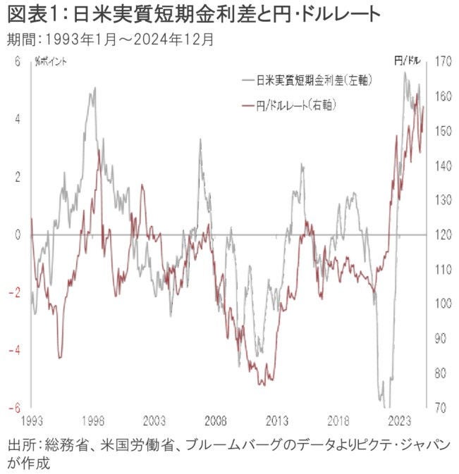 円/ドルレートは、大きな流れとして日米の実質短期金利差に連動してきた(図表1)。それを前提とした場合、両国の政策金利、そして物価上昇率が為替水準の決定要因に他ならない。