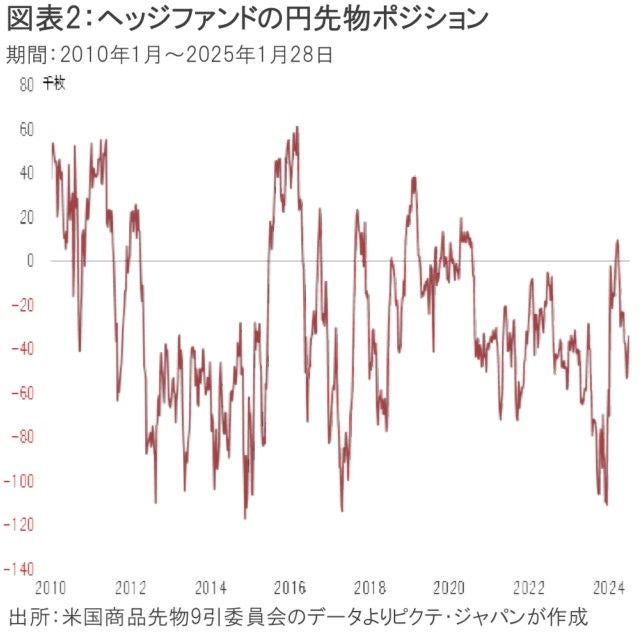 米国商品先物取引委員会(CFTC)が集計するヘッジファンドの円先物ポジションは、日銀による出口戦略への思惑を背景に、昨年10月、一時円の買い越しになった(図表2)。その後、日本の利上げはペースが緩慢との認識が拡がる一方、米国経済が堅調との見方が強まったことで、改めて円のショートポジションが増加している。ただし、何かを契機としてこれが解消される場合、円買い・ドル売りの需給要因になるだろう。
