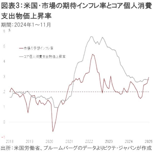そうしたなか、ファンダメンタルズ面でトランプ大統領の政策が為替に影響を及ぼす可能性があるのは、インフレ圧力に他ならない。特に同大統領は、通商交渉のみならず、外交ツールとして関税を使う意向のようだ。関税は輸入国の事業者に納税義務があるため、最終的には価格転嫁され、米国のインフレ率に強く影響する。2年物長期国債とインフレ連動債の利回りから算出した期待インフレ率は、足下、3%近辺へ上昇した(図表3)。2年ぶりの高水準であり、米国でインフレ観測が強まっていることを示すだろう。目先、米国の短期実質金利は低下するのではないか。