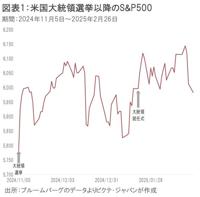 しかしながら、少なくともこれまでのところ、結果は必ずしも芳しくない。大統領選挙が行われた昨年11月5日との比較した場合、就任直前の営業日だった今年1月17日の時点で、S&P500は3.7%の上昇に止まった(図表1)。また、就任後、2月26日までだとS&P500は0.7%下落している。