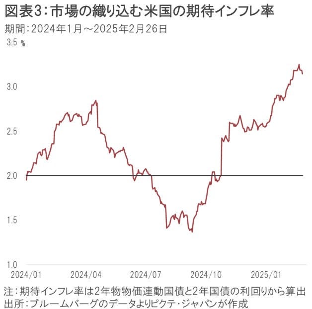 トランプ大統領による政策のリスクを如実に反映しているのが、市場の期待インフレ率だ。2年国債とインフレ連動債から算出した期待インフレ率は、昨年11月5日の大統領選挙当日に2.39%だったが、2月26日の時点では3.12%になった(図表3)。