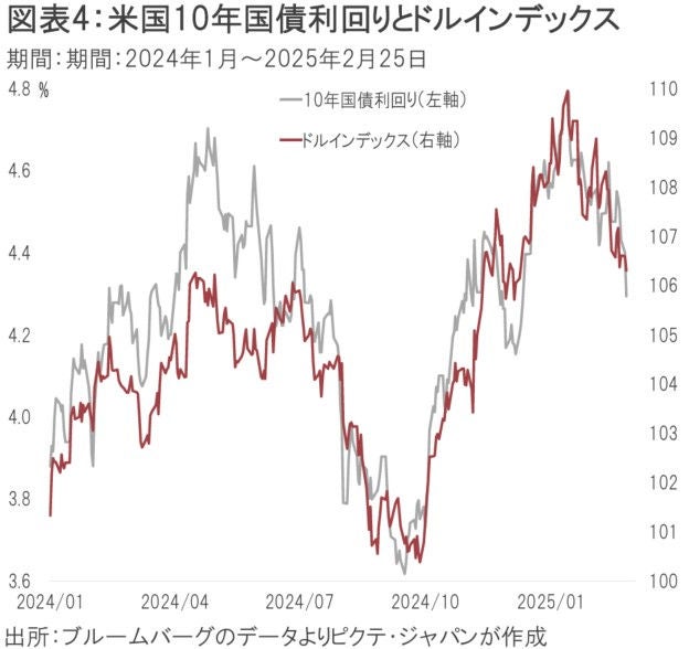 トランプ大統領が就任してから2月26日まで、米国市場では28営業日が経過した。第1次政権において、S&P500は2016年11月8日の大統領選挙から就任前日まで6.2%、就任日から28営業日目まで4.1%上昇している。政権公約で減税や規制緩和を掲げて再登板したトランプ大統領に対しては、今回も市場内において株価上昇への期待感が強かったのではないか。