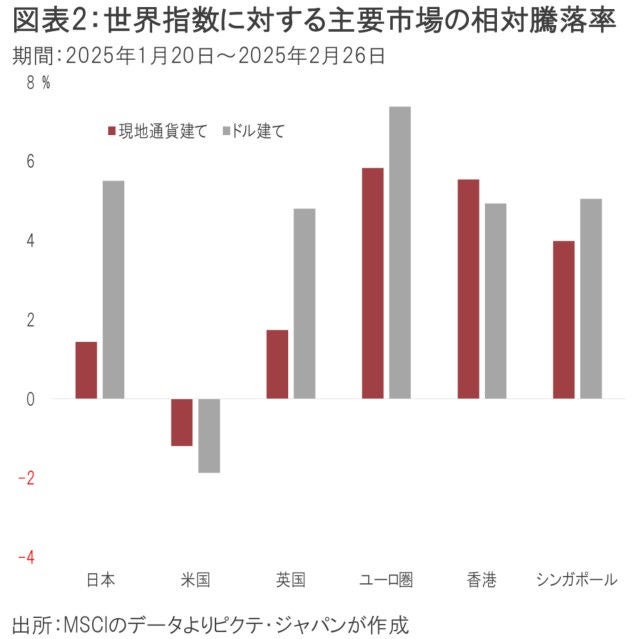 MSCI世界指数に対する米国株の相対騰落率は、就任日を基準にすると、現地通貨ベースで1.2%、ドルベースだと1.9%のアンダーパフォームだ(図表2)。1月31日の時点で米国株のウェートは世界指数の73.6%に達する。その巨大マーケットが世界平均に出遅れているため、日本株を含めた他の主要市場は軒並みアウトパフォームとなった。つまり、米国株は、トランプ大統領の就任後、言わば一人負けの状態になっている。