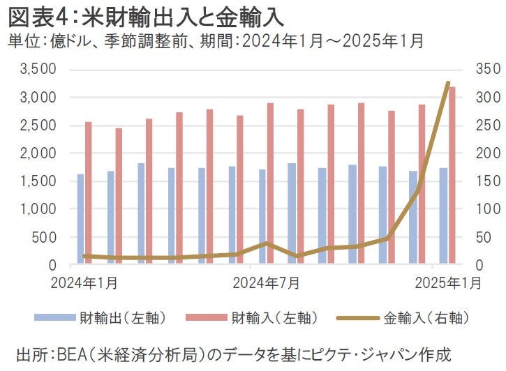 金の輸入は2024年12月時点の132億ドルから、2025年1月には326億ドルまで約2.5倍に急増した(図表4)。これもトランプ関税を見越した取引と考えられるが、重要なのは、このような裁定取引に関わる金の輸入はGDPの算出に含まれないことだ。アトランタ連銀によると、金の輸入の影響を除いた場合、3月7日時点のGDP予測は+0.4%に上方修正されるため、株式市場における米景気後退懸念は過剰かもしれない。