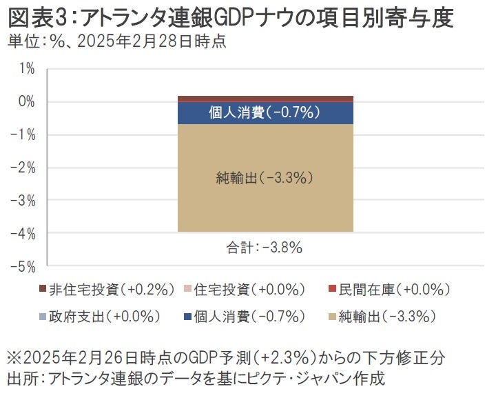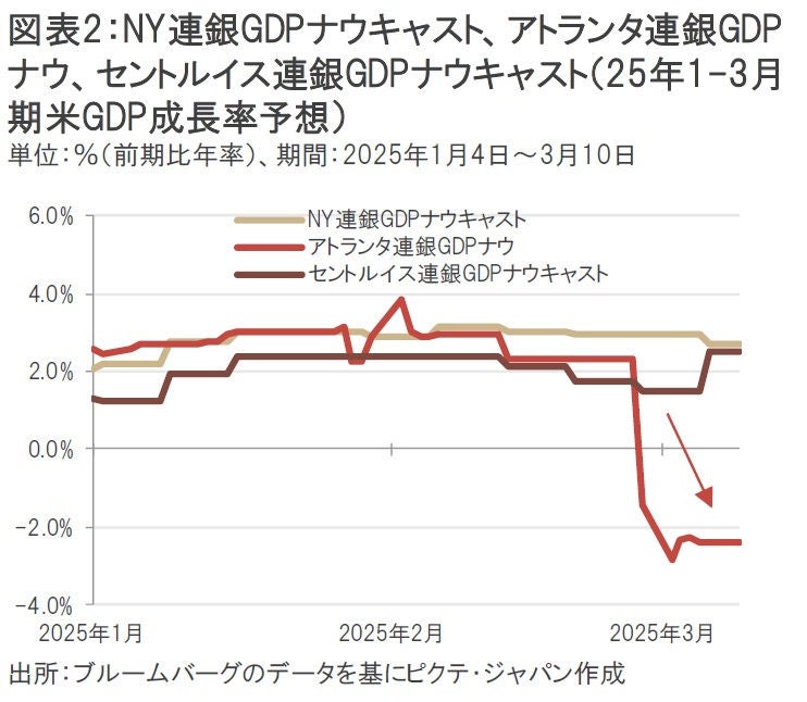 米アトランタ連銀が算出するGDPナウ(25年1-3月期米GDP成長率の予測値)は、2月28日時点で+2.3%から-1.5%へと3.8%ポイントも下方修正されていた(図表2)。これにより、堅調な経済成長を期待していた投資家は、突然の予測変更に不意を突かれる形となった。トランプ大統領のインタビューは、こうした景気後退懸念をさらに強めるきっかけに過ぎなかった。