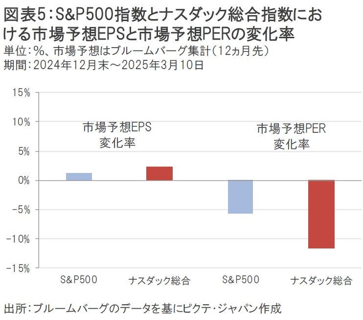 2025年3月10日時点における米国企業の市場予想EPS(1株当たり利益、12ヵ月先)の成長率を昨年末時点から比較すると、S&P500指数とナスダック総合指数はどちらもプラスの変化率を示しているが、市場予想PER(株価収益率、12ヵ月先)はマイナスの変化率となっている(図表5)。つまり、株価急落は業績見通しの悪化ではなく、バリュエーションの低下(不安心理や需給要因など)が原因ということになる。