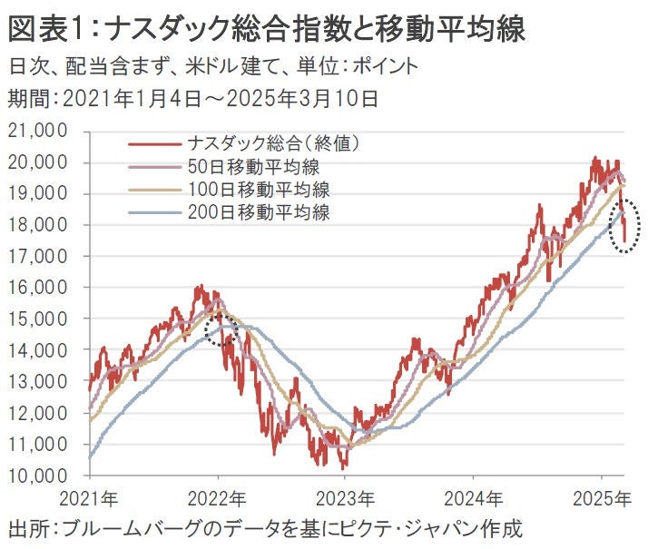 3月10日のナスダック総合指数は前日比4.0%安の17,468.32ポイントで取引を終了し、昨年12月16日の高値(20,173.89ポイント)から13.4%下落した(図表1)。この急落の原因はトランプ政策にある。