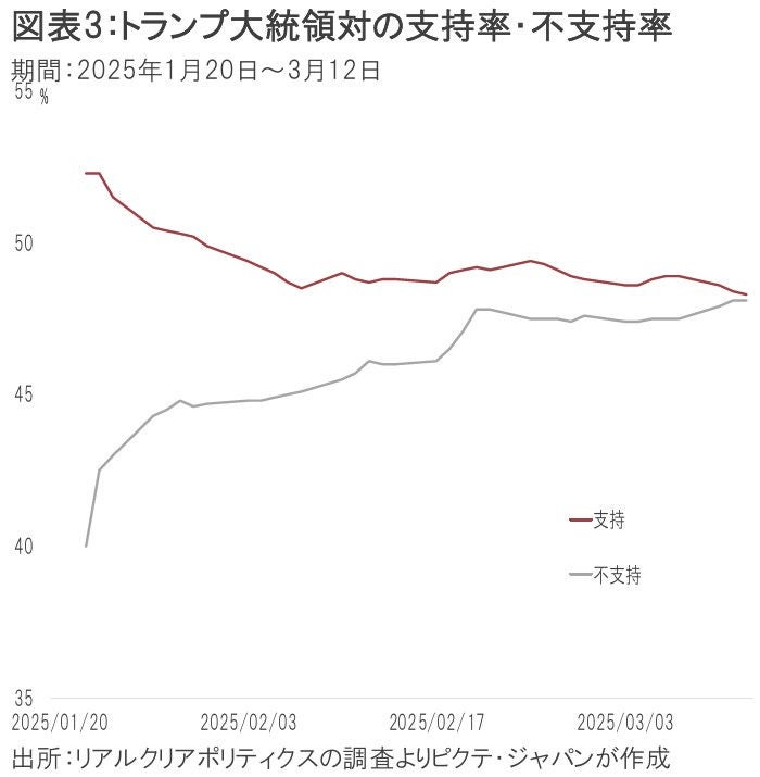 トランプ大統領は3月12日で就任から53日目を迎えたが、リアルクリアポリティクスの集計によれば、最新の世論調査による支持率は48.3%だ(図表3)。就任直後の52.3%からやや低下、不支持率の48.2%とほぼ拮抗している。