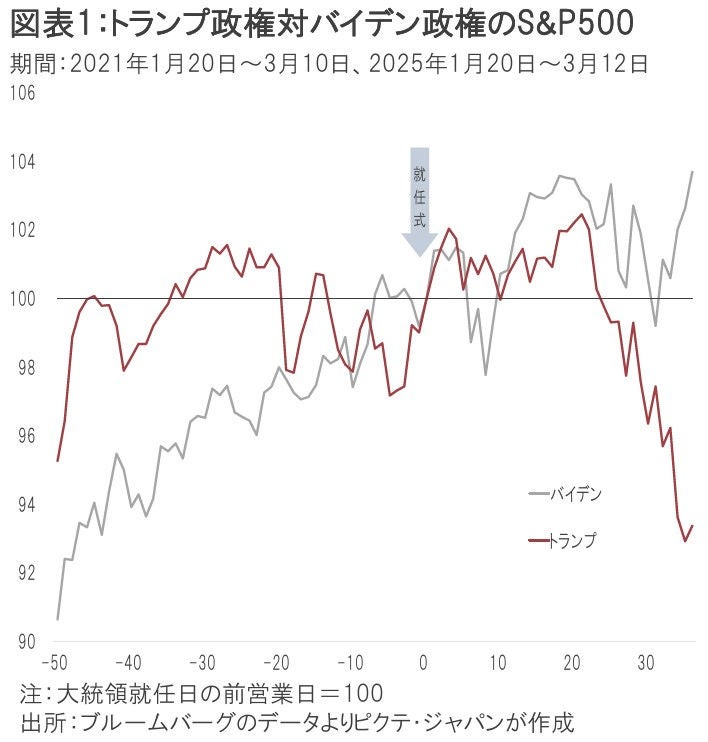 S&P500は、トランプ大統領の就任から3月12日までの36営業日で6.6%下落した。多様な問題に関する制裁的関税の発動で国際社会を震撼させ、ウクライナのウォディミル・ゼレンスキー大統領に謝罪の手紙を書かせるなど、トランプ旋風が世界を席巻している。しかしながら、マーケットによる評価はこれまでのところ厳しいものになっている。ちなみに、ジョー・バイデン前大統領の場合、36営業日目のS&P500は3.7%の上昇だった。