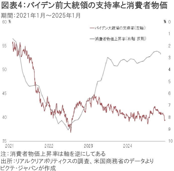 特に重要なのが、物価ではないか。国民生活に直結するからだ。バイデン前大統領の支持率は、2021年前半から2022年央に掛け、消費者物価が急速に上昇するなか、連動して低下した(図表4)。その後、物価は落ち着いたものの、「インフレ」の印象を拭えず、同前大統領は支持率が回復しないまま再選断念へ追い込まれている。