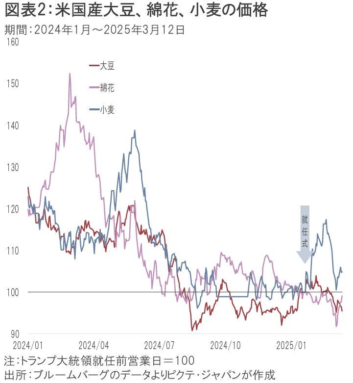 また、中国政府は3月10日より米国からの輸入品に関し、小麦、綿花、トウモロコシ、鶏肉など29品目に15%、大豆、豚肉、牛肉など711品目に10%の追加関税を課した。大豆や綿花は対中輸出が低迷するリスクから価格が下落しており、全米農業連盟のジッピー・デュバル会長が強い不満を表明している(図表2)。農業従事者は共和党にとって非常に重要な支持層に他ならない。