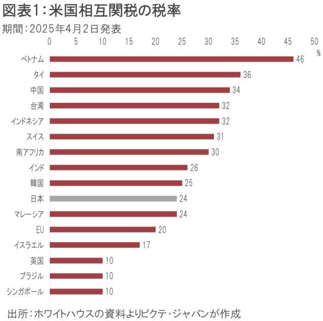 相互関税として、ベトナムの46%を筆頭に、中国34%、インド26%、日本は24%の税率が課されることになった(図表1)。同時に全ての輸入品に対して10%の基礎的関税が導入される。