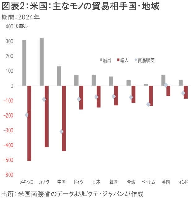 今回、トランプ大統領がメキシコ、カナダへの重い関税率適用を見送った要因の一つは、両国との貿易取引が、輸入だけでなく、輸出も巨額であることではないか(図表2)。両国が報復関税など対抗措置を採った場合、米国の輸出事業者が受ける影響も甚大になることが想定されていた。