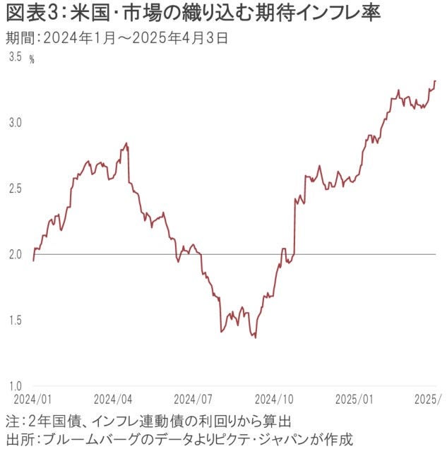 2年国債とインフレ連動債の利回りにより算出した市場の織り込む期待インフレ率は、4月2日の時点で3.31%へと上昇した(図表3)。これは、FRBが「長期的な目標」とする2%を大きく上回る。従って、金融政策にも影響が及ぶ可能性は強い。
