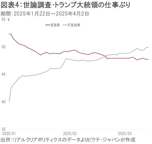 リアルクリアポリティクスの集計では、トランプ大統領の仕事に対する世論調査で、既に支持率が不支持率を下回った(図表4)。仮に米国がスタグフレーションになれば、早い段階で共和党内においてトランプ離れが起こることもあり得るだろう。