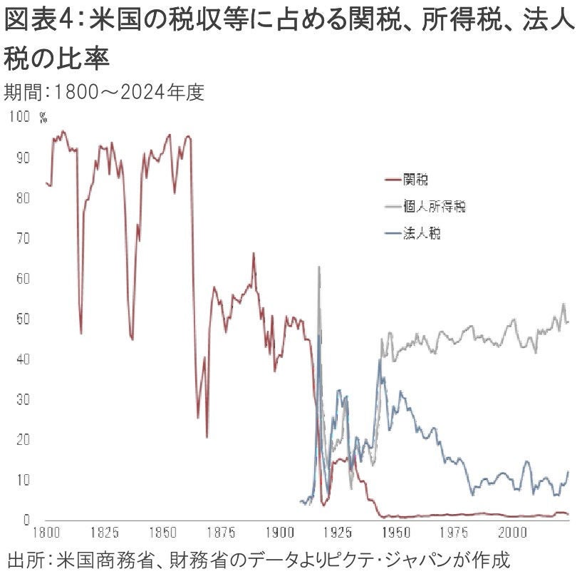 2024年、米国の対メキシコ輸出額は3,340億ドル、対カナダは3,494億ドルに達する(図表3)。両国が報復関税を導入した場合、米国の産業・企業も甚大な影響が避けられないだろう。従って、米国の輸出が少ない中国、日本など他の主要貿易相手国・地域と差を付けたと考えられる。トランプ政権が関税に拘る理由は、貿易不均衡是正が理由とされてきた。しかし、真の狙いが別にある可能性は否定できない。ハワード・ラトニック商務長官が度々指摘してきたように、建国から19世紀後半まで、米国連邦政府の税収等のうち90%程度を関税が占めていた(図表4)。一方、所得税は1913年に制度として恒久化され、現在は税収等の50%程度に達している。