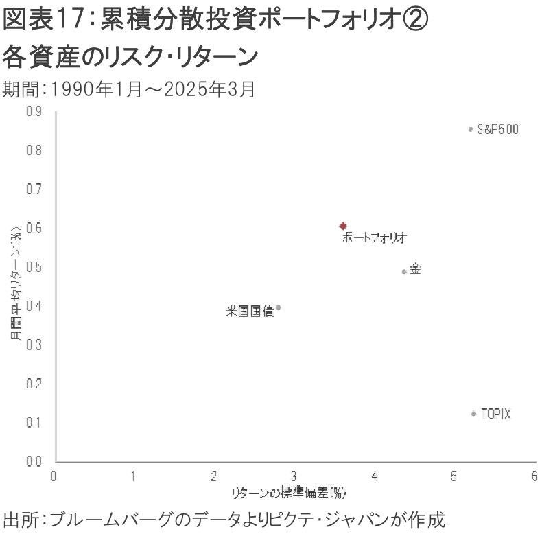 ちなみに、当該4つの金融資産のなかで、金は他の資産の値動きに対する相関が極めて低い。その結果、最もパフォーマンスの良いS&P500に比べ、累積分散ポートフォリオはリスクを限定しつつ、結果として良好なリターンを残している(図表17)。