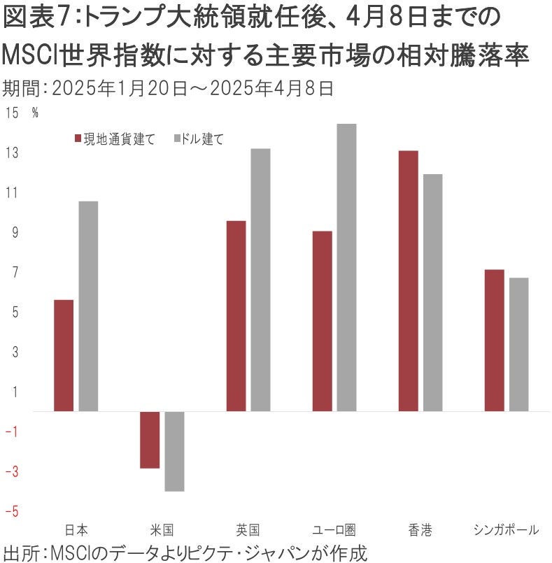 つまり、企業が米国の生産拠点を強化する場合、建設労働者、工場労働者の不足に直面、コストの大幅な上昇が見込まれる。また、工場建設には計画段階から長期間を要するため、生産拠点の米国回帰は簡単には進まない可能性が強い。結局、高額の関税を払って輸入が続き、物価が上昇するのではないか。それは、景気停滞下におけるインフレのシナリオだ。トランプ政権発足以降、相互関税を強硬しようとした4月8日まで、米国株が世界指数のパフォーマンスに一人負けしていたのは、市場がスタグフレーションの可能性を織り込みつつあったからと考えられる(図表7)。
