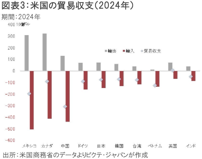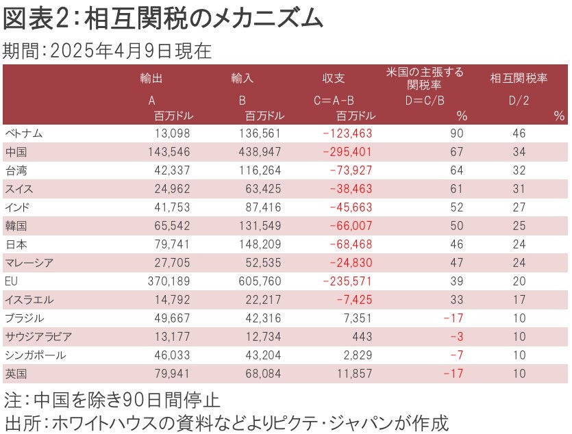 相互間税の算定に関し、米国通商代表部は根拠の説明をしているものの、結局は「相手に対する米国の貿易赤字額/相手からの米国の輸入額」を当該国・地域の関税率とした上で、その半分が相互関税率とされた(図表2)。もっとも、この算出方法の合理的な説明は困難だろう。