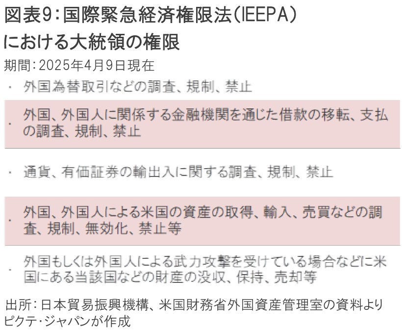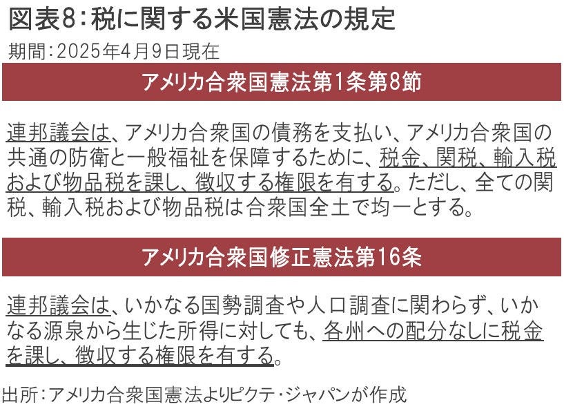アメリカ合衆国憲法第1条第8節は、関税を含む課税について、連邦議会の権限と明記している(図表8)。また、1913年に当時の48州中42州の批准によって制定された修正憲法第16条でも、課税、徴収は連邦議会の権限とされた。米国は「代表なくして課税なし」を掲げて英国から独立した歴史を持つ。従って、連邦議会による課税は極めて厳格な原則とされてきた。