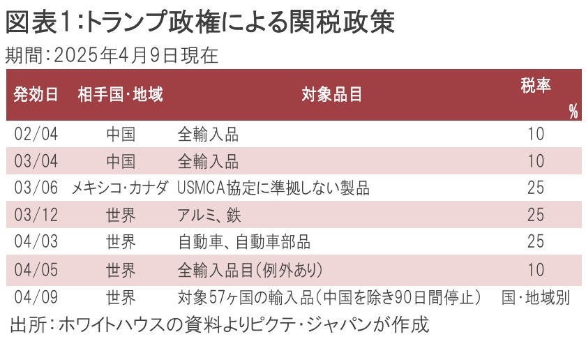 トランプ大統領は、9日13時18分にトルゥースソーシャルへ投稿、同日0時1分に発動した相互関税について、90日間の停止を発表した。ただし、一律10%とした基礎部分は据え置き、鉄・アルミ、自動車など個別品目を対象とした関税も継続している(図表1)。さらに、対米報復関税を発表した中国に対しては、税率を125%へ引き上げた。