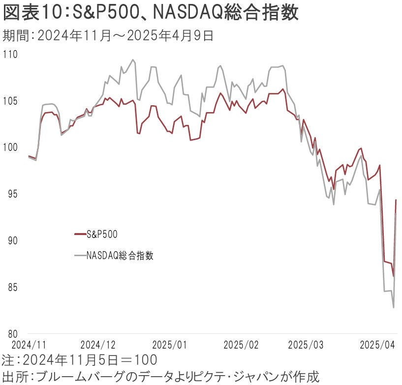 トランプ大統領による、9日のトルゥースソーシャルへ投稿は、1)中国への追加関税率を125%へ引き上げること、2)報復措置を講じなかった他の国・地域に関しては、90日間、一律10%の税率を適用すること・・・2点がポイントだ。同大統領の就任以降、米国の株価は急落していた(図表10)。結局、マーケットに屈したと言えるだろう。