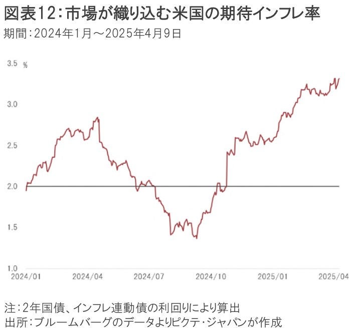 二つ目の課題は、56ヶ国に課した高率の相互関税は中止されたものの、全貿易相手国・地域に対する10%の基礎税率は維持されたことだ。さらに、中国に対して125%の高率の関税が適用される。米国の国内産業が輸入品の代替を供給できるとは考え難い以上、これは、米国のコストを上昇させ、インフレ圧力になるのではないか。市場が織り込む期待インフレ率は3%を超えている(図表12)。