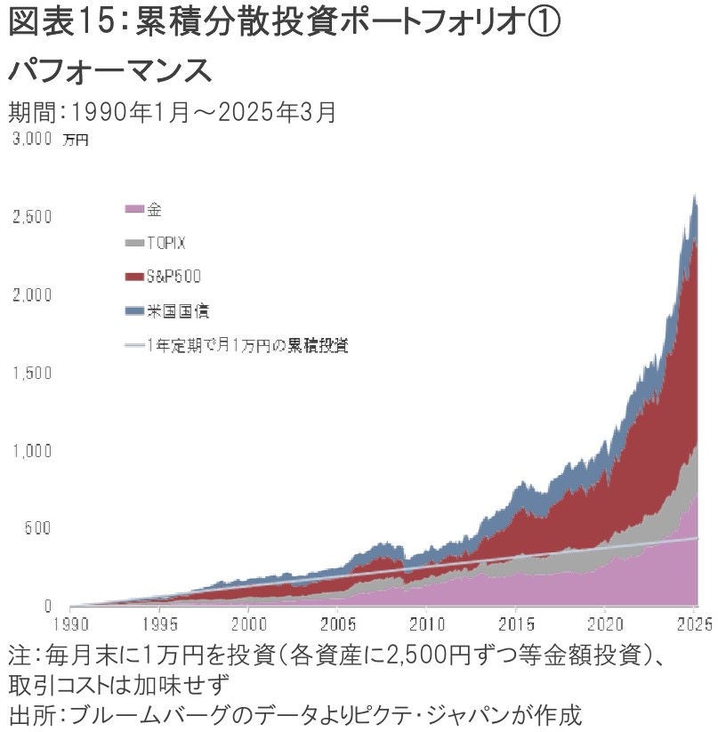 分散投資の有効性を確認する上で、4資産による累積投資のシミュレーションを行った。具体的には、資産バブルが崩壊した1990年1月から、月末に1万円を金、日本株(TOPIX)、米国株(S&P500)、米国10年国債へ2,500円ずつ等金額投資するものだ。リターンを計算する上で、取引コストは加味していない。