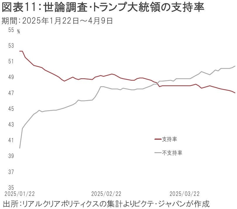 株価下落が続く場合、逆資産効果への懸念だけでなく、民意がトランプ大統領の政策へ不信感を強めていた可能性がある。リアルクリアポリティクスによれば、3月13日以降、世論調査による同大統領へ支持率は、不支持率を下回った状態だ(図表11)。この傾向がさらに強まる場合、同大統領の指導力に影響が生じかねない。ただし、全てを見直せば敗北であり、中国へ強硬姿勢を維持した上、基礎税率の10%を残したのではないか。