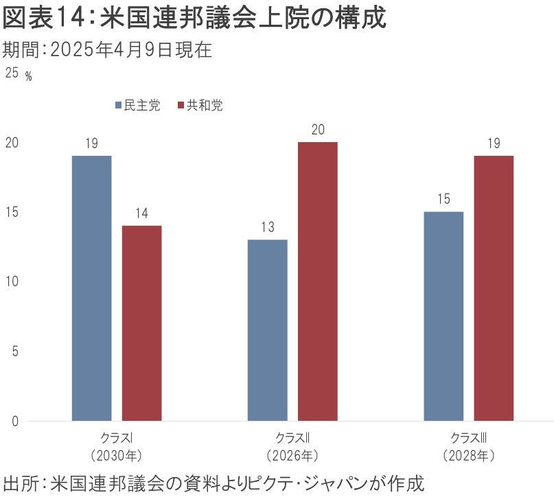 しかし、来年年11月には中間選挙があり、上院はクラスIIの33議席、下院は全435議席が改選になる。上院の場合、クラスIIは民主党の現職が13名なのに対し、共和党は20名と多い(図表14)。仮に米国経済がスタグフレーションに陥った場合、国民の反発は強まるだろう。結果として上下院の何れかで共和党が過半数を失えば、トランプ大統領は任期を2年残してレームダック化が避けられないのではないか。