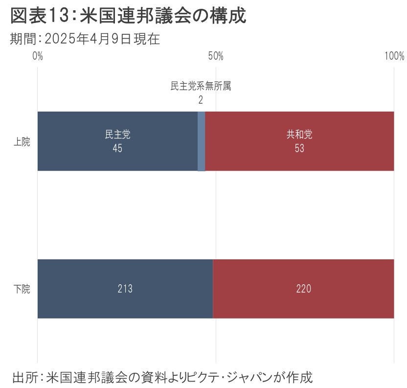 昨年11月の総選挙で共和党は大統領、連邦上院、下院を何れも制した(図表13)。下院の共和党議員は、トランプ大統領の熱烈な支持者が多く、仮に上院でこの法案が可決されたとしても、現段階で下院を通るとは考え難い。