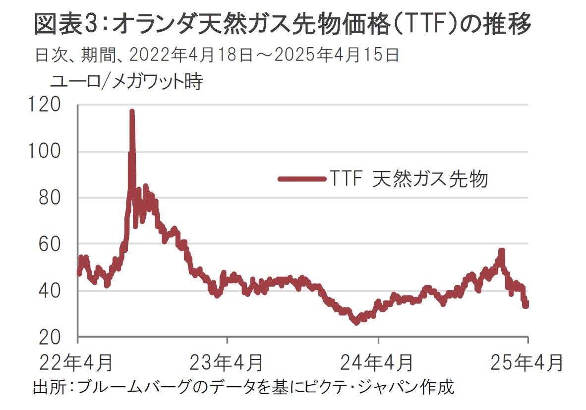 ユーロ圏のインフレ率もデータ更新時期の問題はあるが(最新は3月分まで)、物価目標に向け鈍化を続ける可能性も見いだせる。複数のECBメンバーも、(関税の内容次第という条件付きだが)ユーロ圏の物価の落ち着きを見込む発言をしている。インフレ鈍化を見込む要因としては、ユーロ圏の主要なエネルギー源である天然ガス価格が下落傾向であることや(図表3参照)、原油安、さらにユーロ高や、ECBの調査によると賃金の先行きも鈍化が期待されること、などが挙げられる。